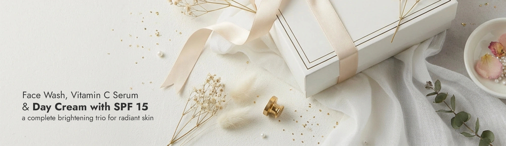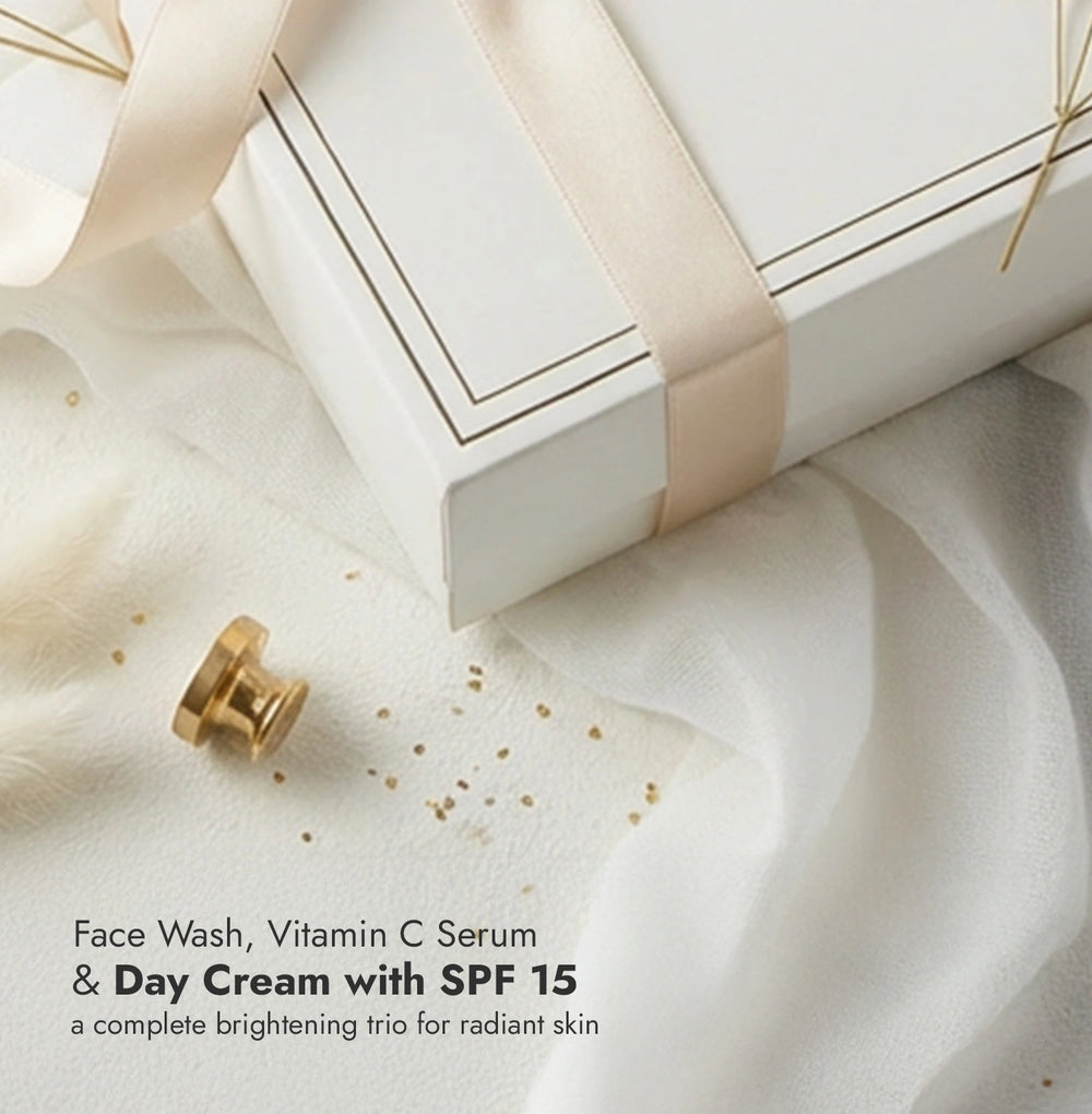 The set includes a soap-free Face Wash, a Vitamin-C enriched Face Serum, and a Day Cream (with SPF 15), creating a complete brightening routine.
