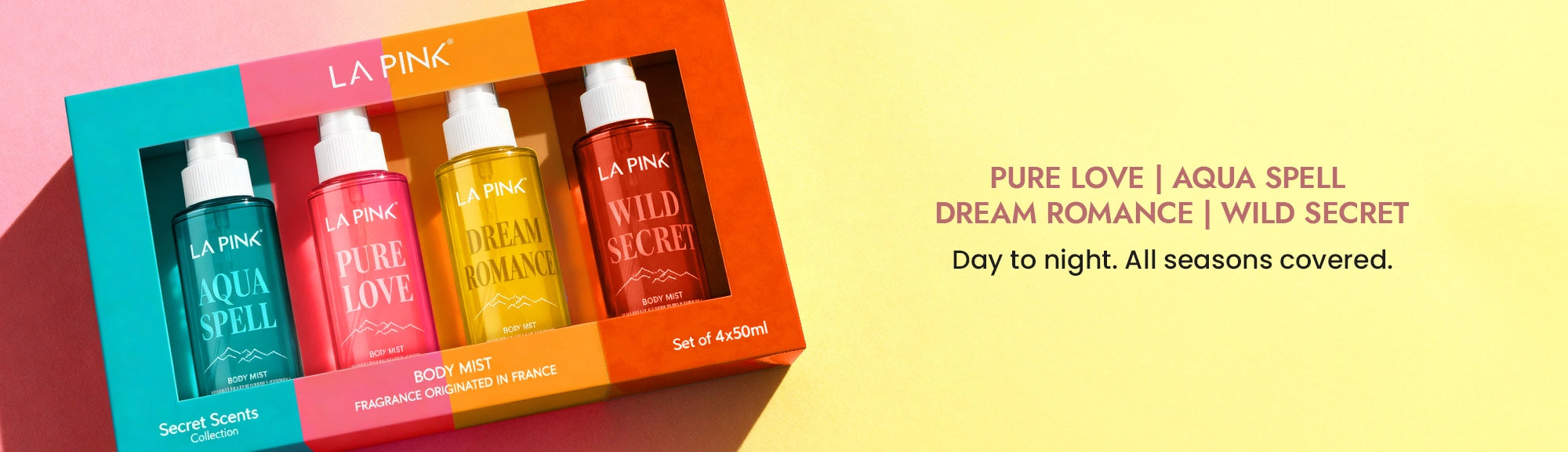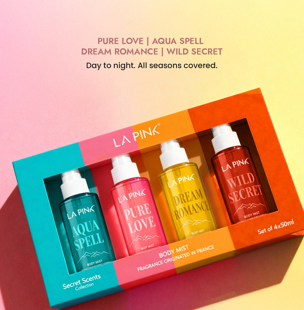 A. La Pink Body Mist Gift Set consists of four exclusive formulations that outcast divergent fragrant spells backed by flourished and versatile notes. These are Pure Love, Aqua Spell, Dream Romance, and Wild Secret.
