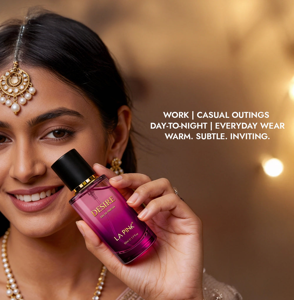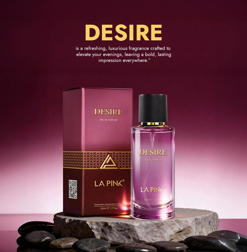 Desire typically lasts up to 9 hours, depending on skin type, application method, and environment. It settles into a gentle musky-woody base that stays close to the skin, offering consistent scent presence without fading too quickly.