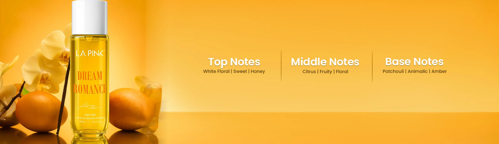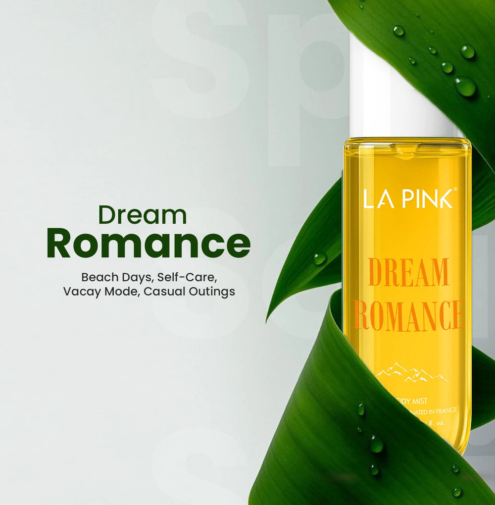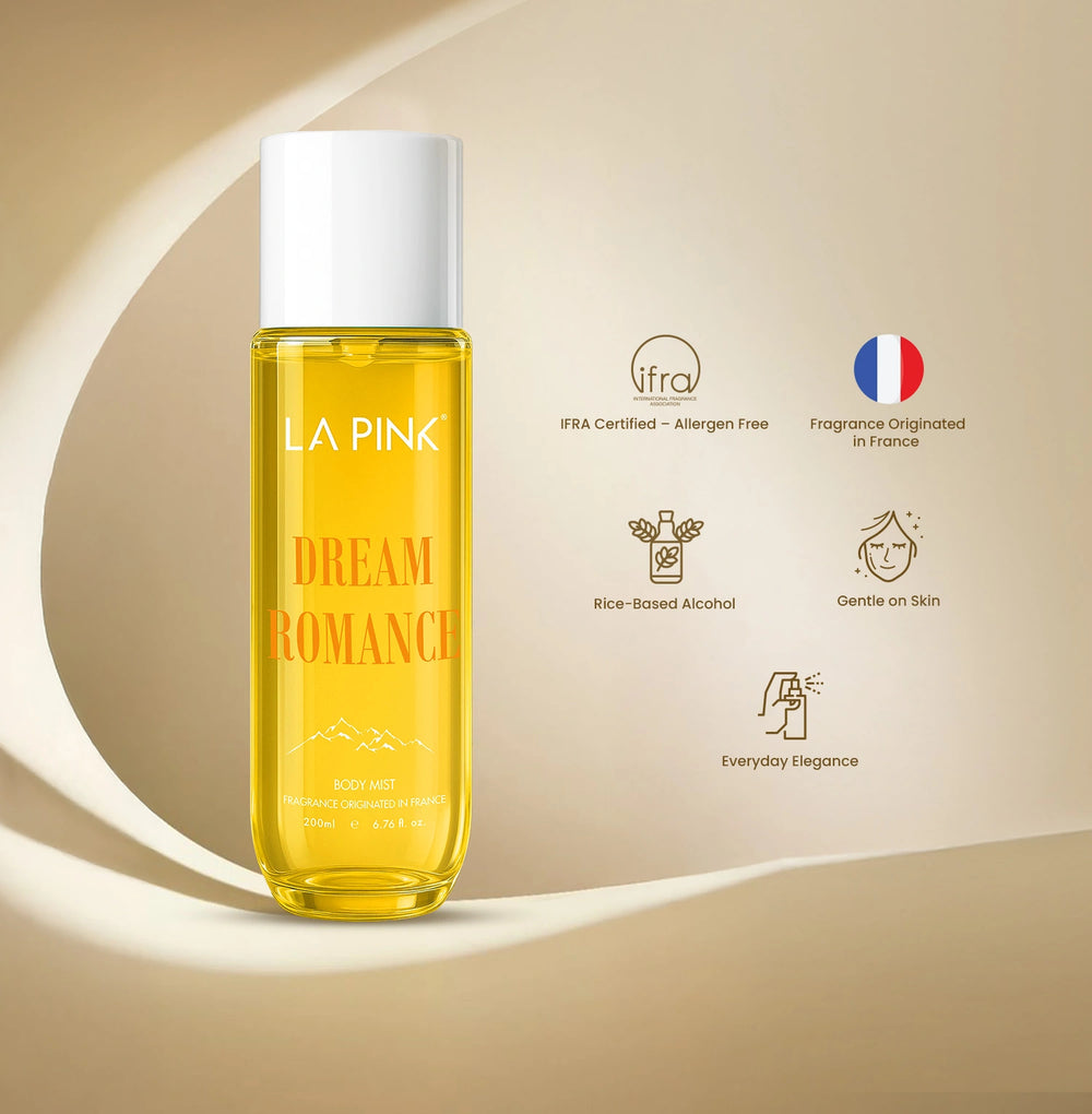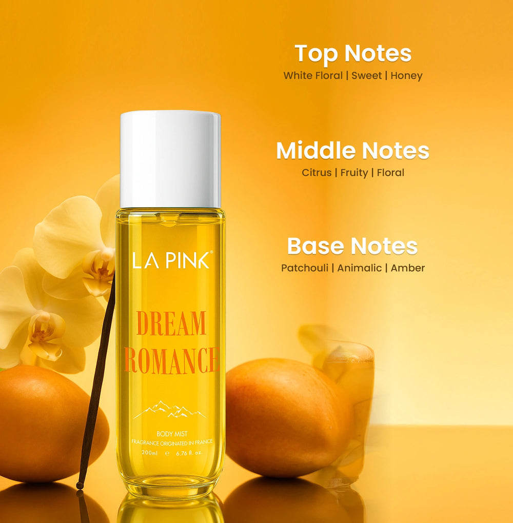 Warm & Carefree Expression: La Pink Dream Romance Body Mist is made with a versatile integration of accords, picked from a diverse range of products. With prominent floral accents, followed by fruity, cyphre, and animalic accents, the body mist is captured with versatility over time. For example, floral for a while, following a swift switch to citrus olfaction that resembles warmth and carefreeness. Therefore, truly by its name, Dream Romance is as captivating as magical dreams.