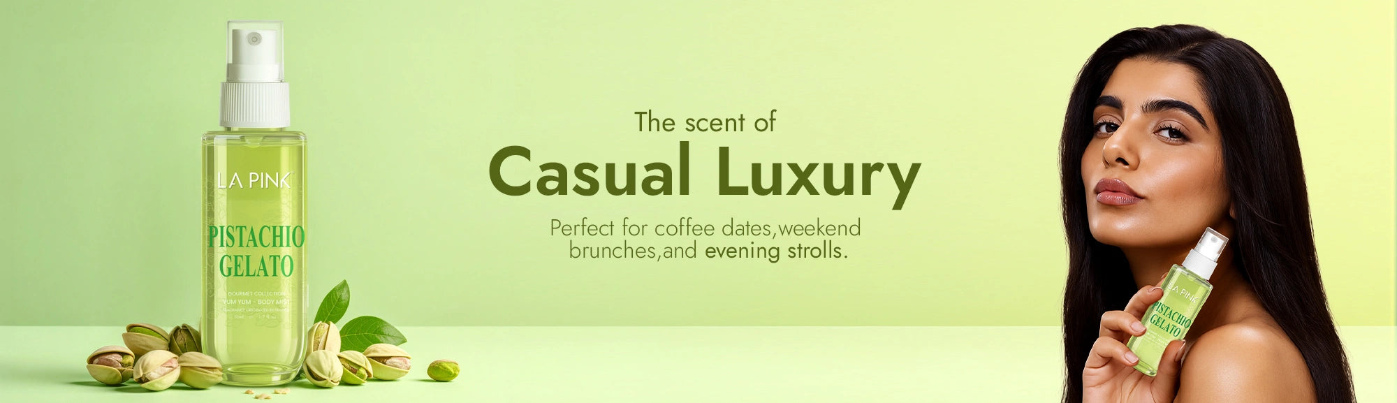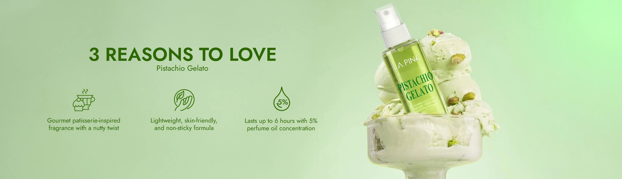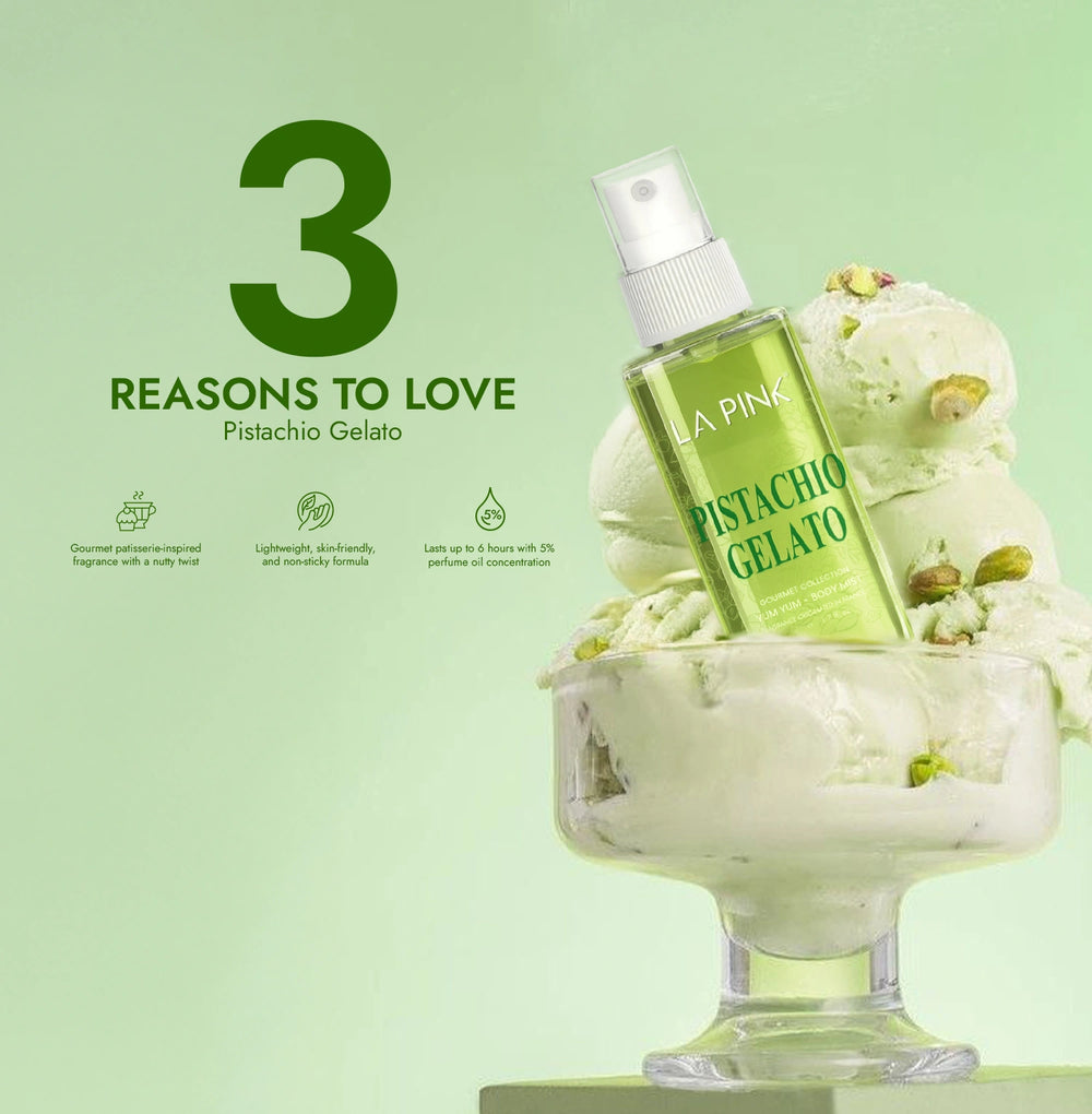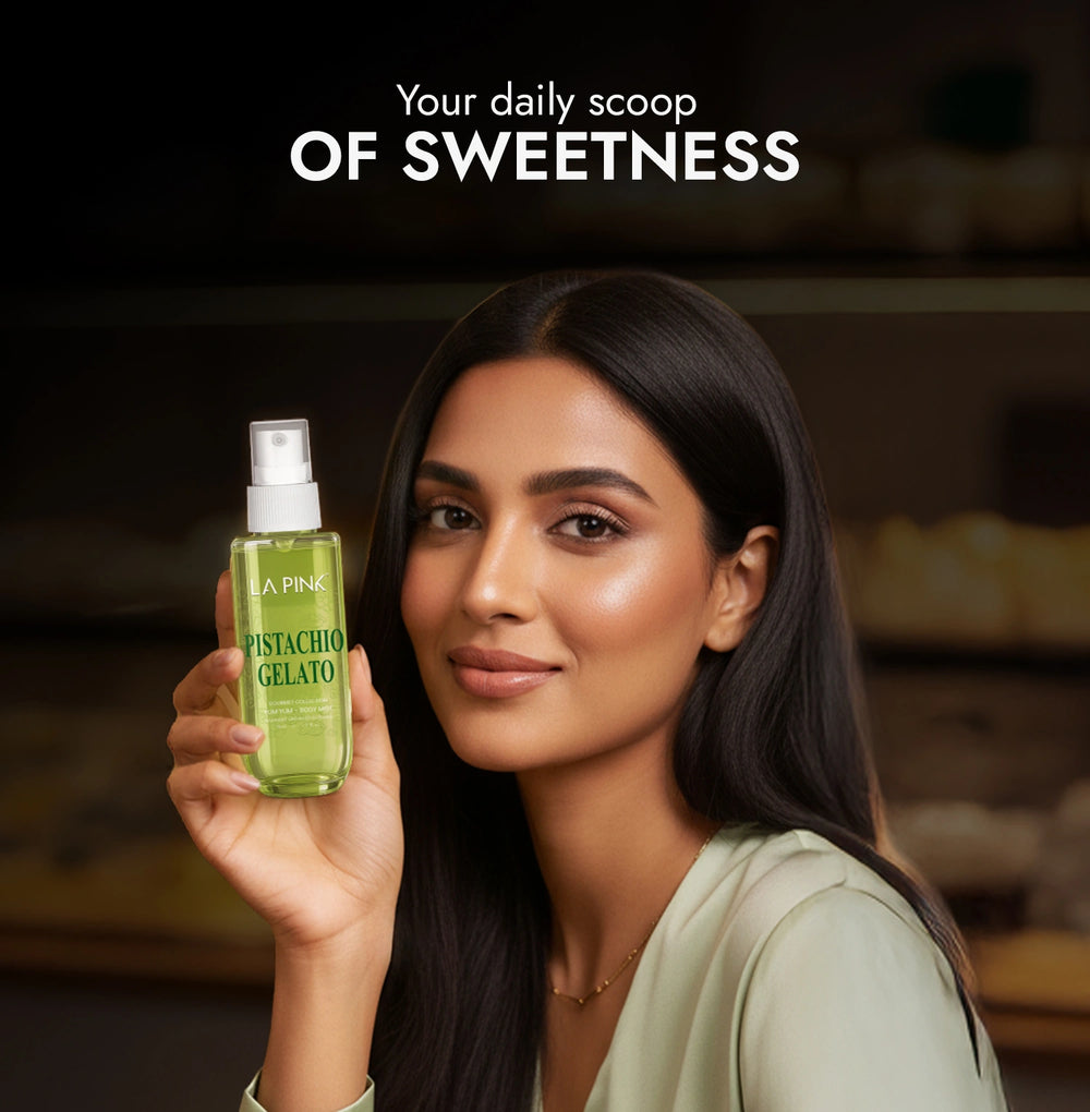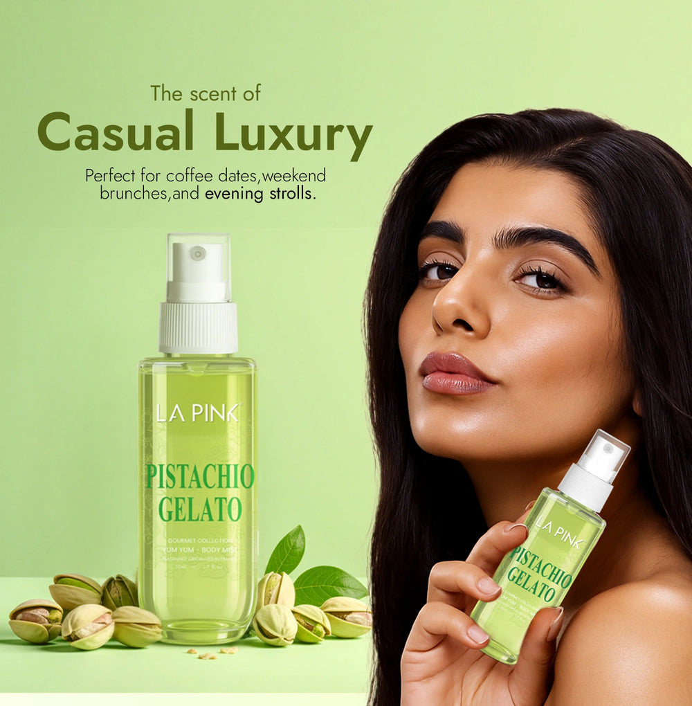 At La Pink, we craft fragrances that are more than just scent, they’re experiences. Pistachio Gelato Body Mist brings gourmet luxury into your everyday routine, with 5% perfume oil concentration, skin-friendly formulation, and a lasting aroma of up to 6 hours. Unlike regular mists, it’s indulgent, sophisticated, and made for women who love to stand out.
