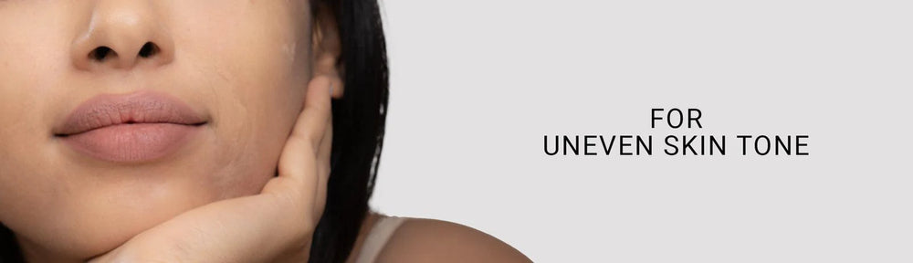 Uneven skin tone refers to an irregular distribution of color or pigmentation on the skin, often appearing as dark spots, redness, or patches that are lighter or darker than the surrounding skin. This can be caused by factors such as hyperpigmentation, hypopigmentation, redness, UV rays, aging factors, and many more.