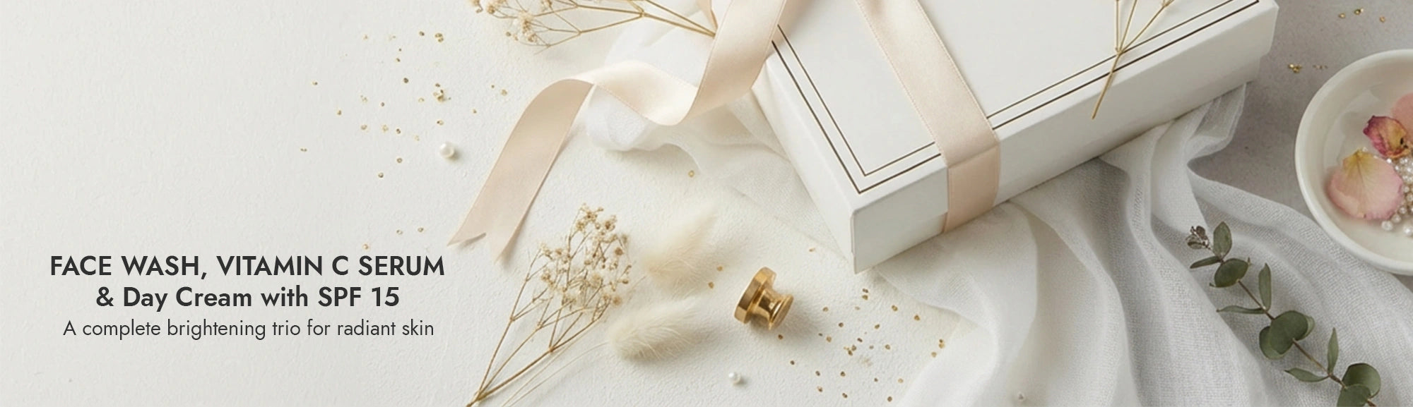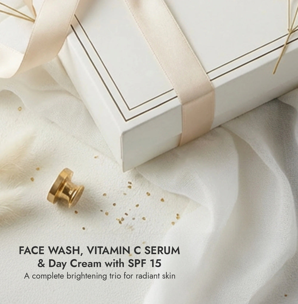 The set includes a soap-free Face Wash, a Vitamin-C enriched Face Serum, and a Day Cream (with SPF 15), creating a complete brightening routine.